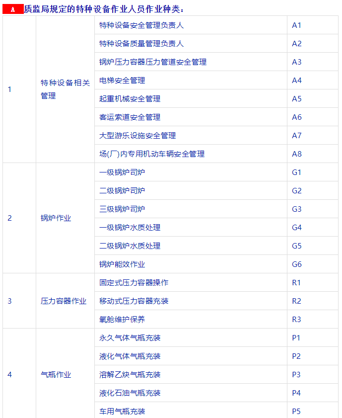 特種設備安全管理人員、叉車司機、起重機司機、起重機指揮、壓力容器、鍋爐、氣瓶充裝、電梯安裝與維修、觀光車、客運索道操作與修理、大型游樂設施操作與維修等等。
